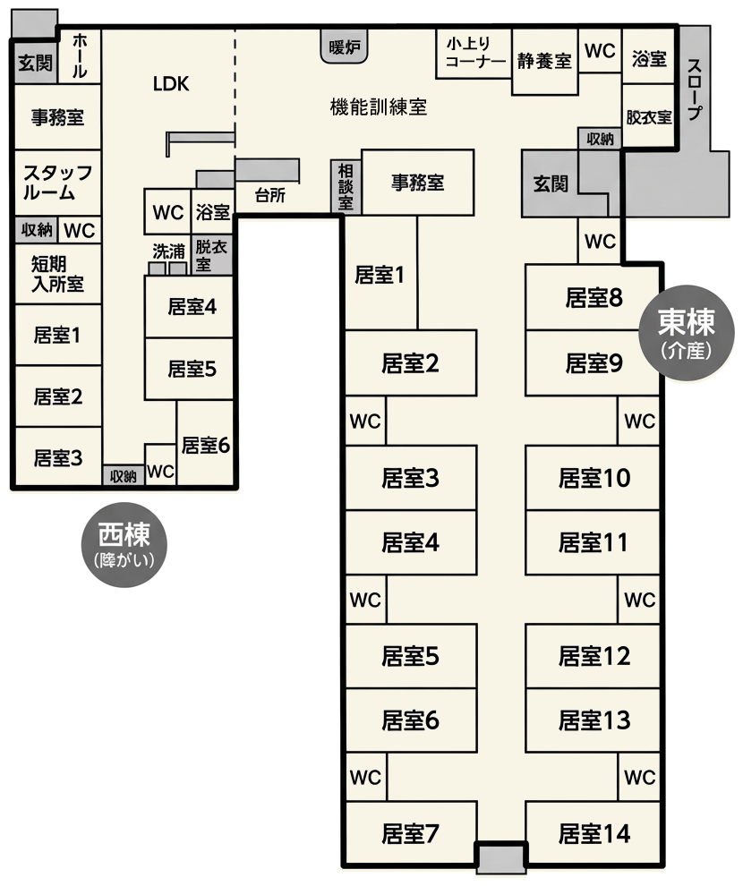 めだかの家Ⅳは、ホールを挟んで障がい者のグループホームと接しており、障害のある若い人たちともふれあえる環境を提供します。